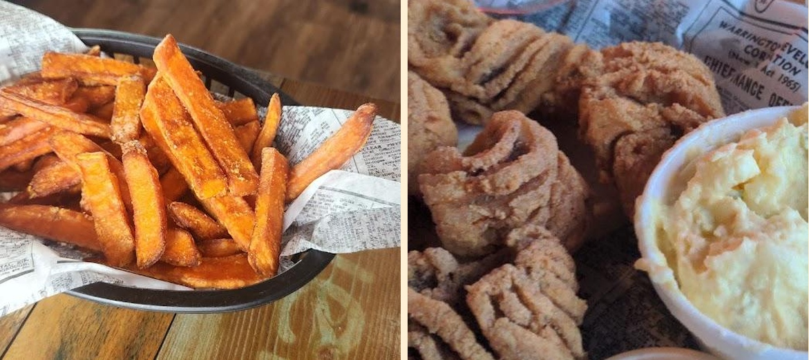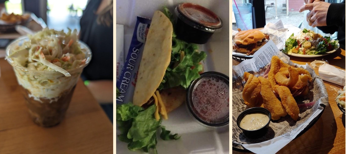 Try the Catfish Fritters and Pulled Pork for a taste of local specialties. The Drifters' Shrimp is also a fan favorite. Don't miss out on their unique frozen drinks like the Drifters' Colada.